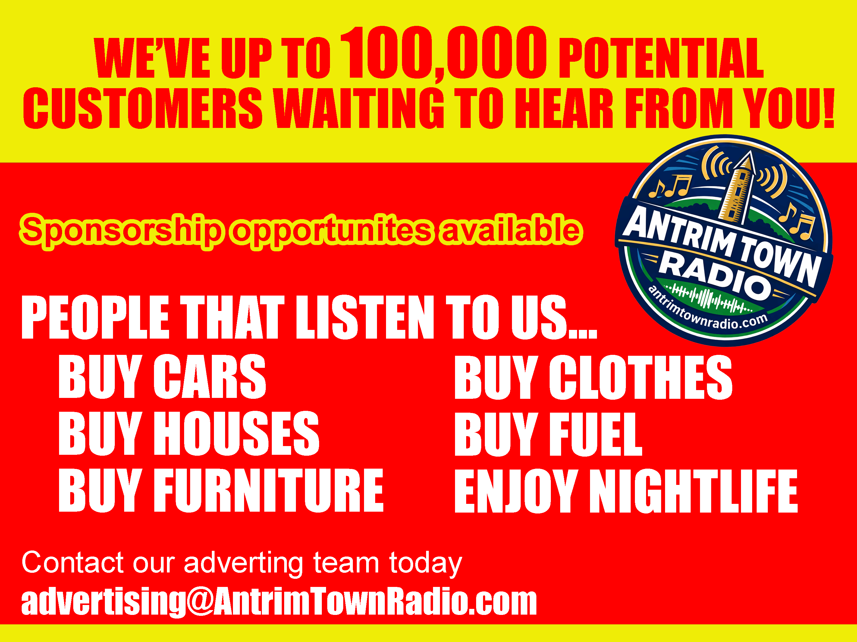 We have various advertising and sponsorship opportunities available on Antrim Town Radio. For further information please contact our sales and promotions team on advertising@antrimtownradio.com